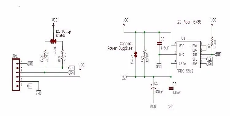 El APDS-9960 es un pequeño hardware serio con filtros de bloqueo UV e IR integrados, cuatro diodos separados sensibles a diferentes direcciones y una interfaz compatible con I2C.Para su comodidad hemos dividido los siguientes pines: VL (alimentación opcional al LED IR), GND (tierra), VCC (alimentación al sensor APDS-9960), SDA (datos I2C), SCL (reloj I2C) e INT ( interrumpir).Cada APDS-9960 también tiene un rango de detección de 4 a 8 pulgadas (10 a 20 cm).